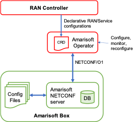 We have started integrating this solution with our RAN Controller, which allows the remote management of Amarisoft-based RANs through a NETCONF/O1 interface. The next figure illustrates the integration of K8S operators and the RAN Controller, where the Amarisoft Operator is now in charge of configuring, monitoring and reconfiguring the Amarisoft boxes according to the service definition stored in the CDR.