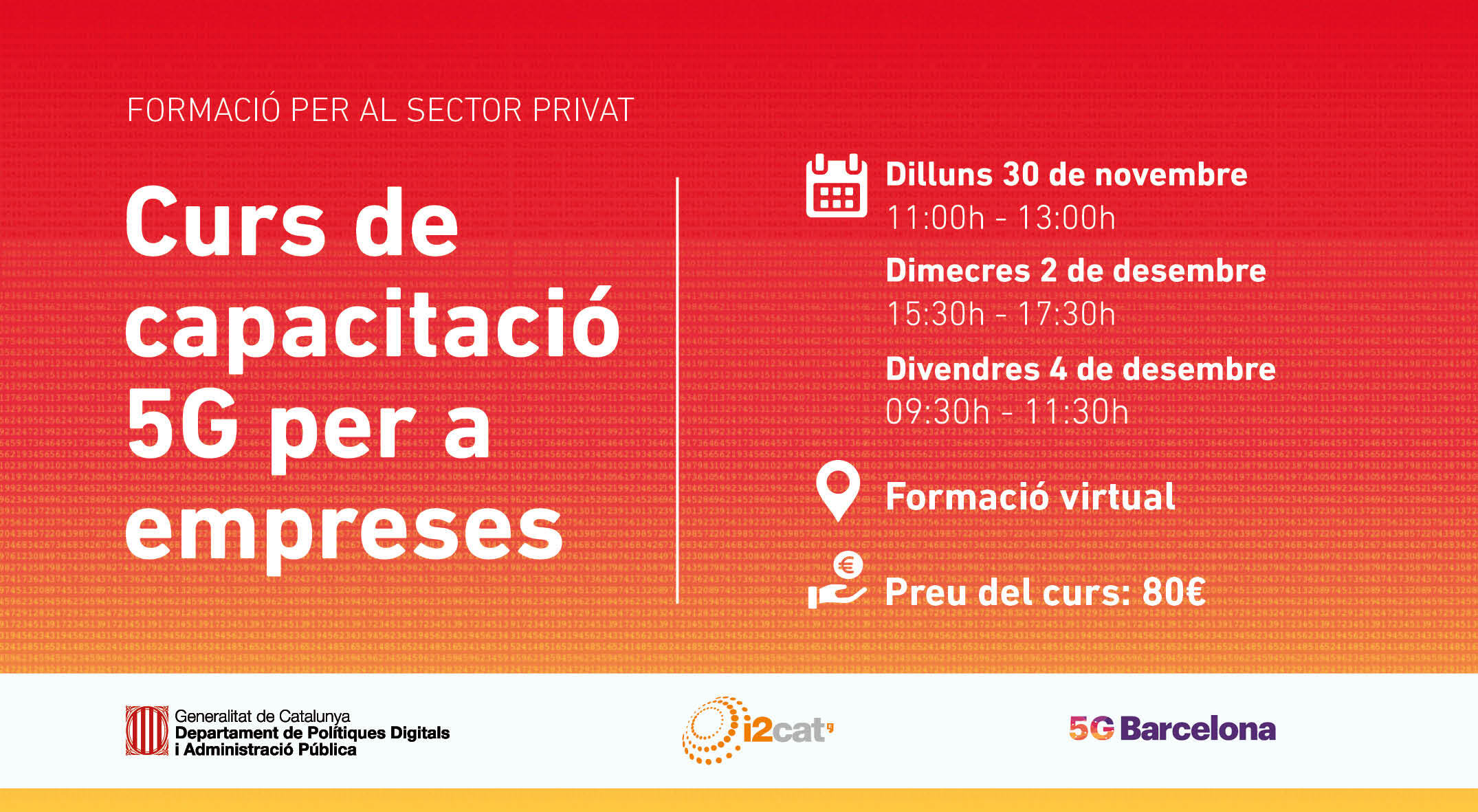 Aquesta formació, repartida en tres blocs formatius de dues hores, s’adreça a companyies que vulguin esdevenir part de l’ecosistema 5G de Catalunya. Es dotarà els assistents de coneixements sobre la 5G, tant pel que fa a un aspecte tecnològic com al relacionat amb els nous models de negoci i les verticals d’ús que apareixeran gràcies a la seva implantació.