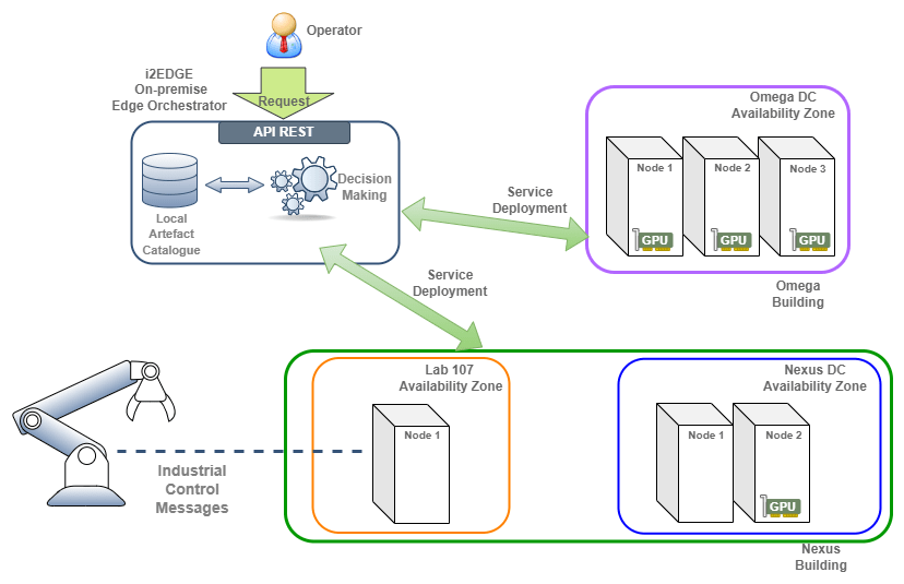 i2EDGE is an advanced on-premise edge orchestrator built to manage the full lifecycle of industrial applications deployed at the network edge. It enables autonomous, zero-touch application deployment, positioning applications closer to data sources and end users to minimize latency and optimize network performance. By offloading computation from the cloud to edge nodes, i2EDGE increases data processing efficiency, reduces network congestion, and provides a more responsive environment for industrial applications. Beyond supporting industrial applications and cloud-native network functions, i2EDGE can register multiple infrastructures or clusters, allowing streamlined management of computational resources across all registered infrastructures. This capability enables applications to be deployed flexibly across nodes, availability zones, or even data centres, with the option to migrate applications dynamically as contextual demands change. This adaptability ensures that applications can operate closer to data sources or end users when required, enhancing both performance and resource efficiency. The diagram below provides a high-level view of a typical deployment architecture, illustrating how services can be strategically deployed on industrial premises to optimize responsiveness and operational efficiency based on application-specific computational or latency requirements.